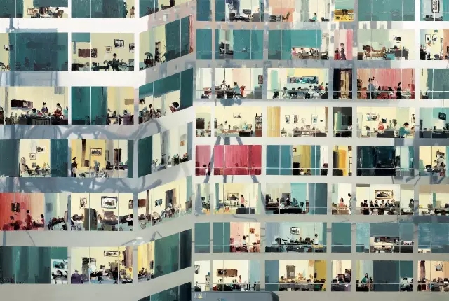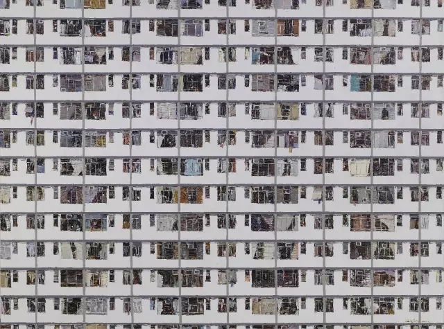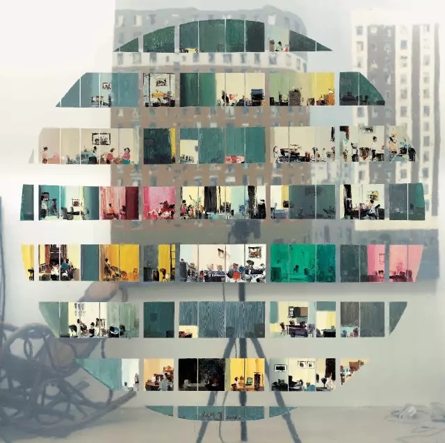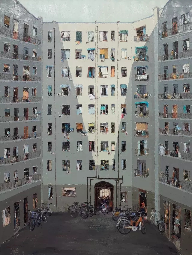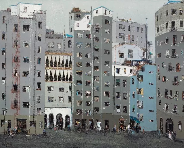 杜海军的创作以城市楼群为主题,在窗中又展现着人生百态,画面具有强烈的形式美感,内容同时略抽象,让人得以久久回味。显然他能够站在这样的视角,去观察他所生活着的不断变化着的城市,他对生活是充满热情的。同时他又是智慧的,能给自己的绘画带上符合时代的标签,被大众所接受。