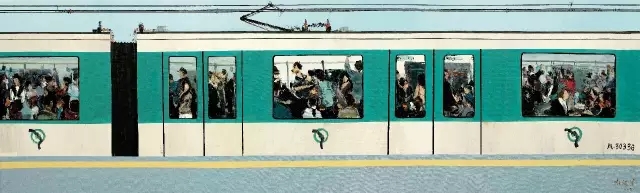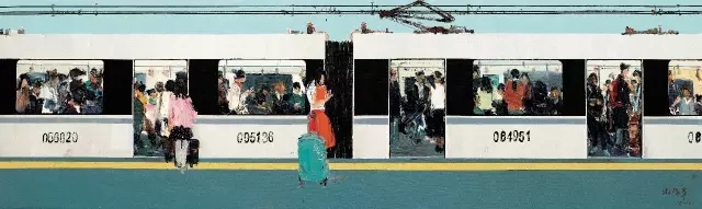 不仅从高楼的窗里看城市,杜海军的画面内容与时俱进,可以说,他绘画的就是当下他自己的生活,当下社会的生活。他常辗转于上海北京两地,高铁上的人群,地铁中的百态,再次引起了他的思考。他敏锐的嗅觉感知到了时代的演变,因此他的创作题材也由楼房转向地铁,高铁,这是对时代的又一次呼应。车厢的窗,窗中的人,或匆忙,或麻木,或精神,各有姿态,这是对城市平常生活的真实写照。也因此,当处于局中人的大众,跑到局外,再看自己的生活剪影时,总能引起一些思考。