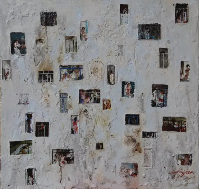 杜海军一直用不同的方式来表现画面,不仅限于油画,对综合材料的运用也勇于突破。看似随意的墙,斑驳之下,也能于其上看到岁月走过的痕迹,《斑驳的墙之三》中用杂志拼贴,不同人物展现着不一样的生活状态,窗户也并非看似随意地排列,仿佛在寻找一个距离和舒适之间最完美的结合状态,也就是当下的最清晰的那个点。强烈的代入感,仿佛让观者一次又一次地置身于他所创造的城中。